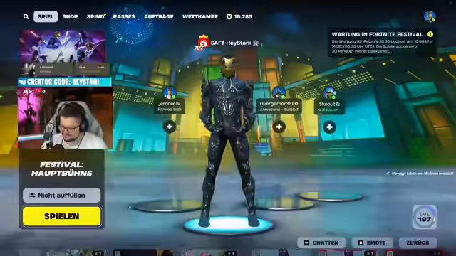 01:14:43Vor dem eigentlichen Start des Streams und dem Update-Check gibt es einige technische und organisatorische Hinweise. Der Streamer weist darauf hin, dass die Spielersuche bald offline gehen wird. Er erinnert die Zuschauer daran, seinen Creator Code 'hey study' im Fortnite-Shop einzulösen. Der Fokus liegt darauf, den Serverstatus des Updates im Auge zu behalten und sich auf die bevorstehende Downtime einzustellen, bevor das Gameplay beginnt.