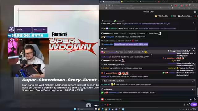 01:48:52Es wird über die anstehende Wartung der Fortnite-Server gesprochen, die planmäßig um 10 Uhr stattfindet und seit acht Jahren immer dienstags erfolgt. Ein junger Viewer, Kevin, wird aufgrund seines Namens fälschlicherweise mit dem Streamer gleichgesetzt. Die Kommentare werden jedoch ignoriert und es wird erklärt, dass es keine feste Uhrzeit für die Server-Wiederherstellung gibt.