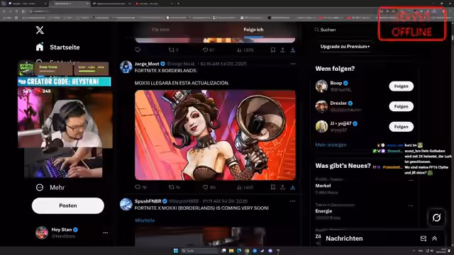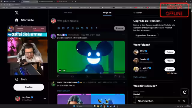 05:20:39Beim Start des Koch-Streams auf der anderen Plattform kommt es zu einem erheblichen technischen Problem. Das OBS-Programm stürzt ab, was die Fortführung des Streams sofort unmöglich macht. Der Streamer versucht mehrmals, das Problem zu umgehen, unter anderem durch den Einsatz eines zweiten OBS-Instanzen und ein Neustarten des Programms, was jedoch fehlschlägt.