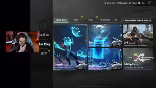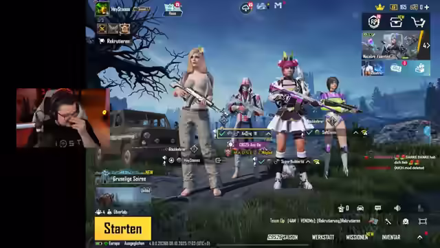 03:04:48Es wird für ein kleines Creator-Event in PUBG Mobile trainiert, bei dem gegen andere Content-Creator und deren Studenten angetreten wird. André, ein Student, wird nach den besten Landeplätzen gefragt und empfiehlt die Schule, passend zum Thema. Es werden Waffenempfehlungen ausgetauscht, wobei M4 und OMP als besonders nützlich hervorgehoben werden. Am 25. ist Sabaton. Es werden die Regeln für zwei Challenges erläutert, die am 12.10. stattfinden: Eine normale Runde mit allen Waffen und eine Special-Runde, in der nur Pistolen, Shotguns, Nahkampfwaffen und Armbrust erlaubt sind, wobei Kills mit Bratpfanne, Granaten und Messer Bonuspunkte bringen. Es wird festgestellt, dass durch das viele Ranked spielen schwerere Lobbys entstehen, was für André, der mitspielt problematisch ist, weil er dadurch im Rang aufsteigt.