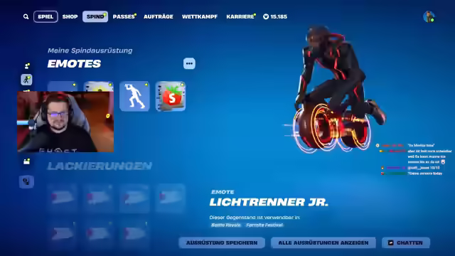 00:37:10Es wird der neue Tron Areskin in Fortnite vorgestellt, der Jared Leto darstellt und verschiedene Stile bietet. Der Streamer kündigt an, wann der Skin im Shop erhältlich sein wird und welche Inhalte im Paket enthalten sind, einschließlich Emotes und verschiedener Stile (mit und ohne Helm). Es gibt den Skin nur in schwarz-rotem Stil, anders als die blauen Tron-Skins der anderen Charaktere. Das Paket enthält ein Backbling mit Reaktivitätsoptionen, zwei Spitzhacken (Disc und Stab von Ares) und einen Gleiter, der als besonders gelungen hervorgehoben wird. Zusätzlich gibt es einen Tron-Bike-Emote und einen weiteren Emote, bei dem die Disc um den Charakter geschleudert wird. Der Preis für das gesamte Paket wird auf 2000 bis 2500 V-Bucks geschätzt. Der Streamer empfiehlt, seinem Instagram-Account zu folgen, um Eindrücke von der Premiere von Tron Ares und dem Treffen mit Jared Leto zu sehen.