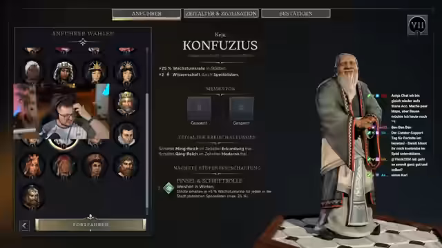 03:12:19Der Streamer lobt den Soundtrack von Civilization 7, der ein mächtiges Weltgefühl vermittelt, als wenn man wirklich eine neue Welt aufbaut. Es wird die Möglichkeit erwähnt, Anführer und Völker komplett unabhängig voneinander auszuwählen, was mehr strategische Tiefe bietet. Der Streamer zeigt die große Auswahl an Anführern wie Kimiko, Königin von Waar, Konfuzius und Karl der Große, und wie man diese mit verschiedenen Zivilisationen kombinieren kann. Er diskutiert die verschiedenen Wege im Spiel, wie Wissenschaft, Militär, Kultur und Wirtschaft, um zu gewinnen.