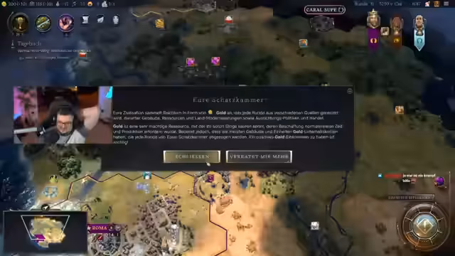 03:20:44Der Streamer zeigt die Auswahlmöglichkeiten beim Start des Spiels, wo man seinen Anführer und sein Volk wählen kann. Er wählt Karl den Großen in Rom und beginnt mit der Stadt Rom, die bereits Salz und Baumwolle als Ressourcen bietet. Er erklärt das System der four main paths: Wirtschaft, Kultur, Wissenschaft und Militär, um das Spiel zu gewinnen. Es werden die ersten Schritte des Gameplays gezeigt, wie die Stadt vergrößert, Ressourcen entdeckt und Technologien wie Segeln und Keramik erforscht werden. Der Streamer betont die strategischen Entscheidungen, die das Spiel beeinflussen.