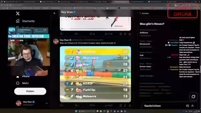 10:02:04Die Runden in Mario Kart World werden als chaotisch und RNG-betont beschrieben, mit vielen roten Panzern und Items, die zufällige Platzierungen verursachen. Trotzdem wird der Spaß betont, und der Streamer fordert die Community auf, erneut beizutreten. Er nennt es einen 'verrückten' und 'anstrengenden' Spielstil.