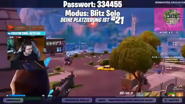 08:28:42Der Streamer startet Blitz Royale Custom Games, da der Modus schnell ist und sich gut für Community-Runden eignet. Nach anfänglichen Schwierigkeiten mit dem Lobby-Abbruch und der Passwort-Eingabe auf der Switch stabilisiert sich der Ablauf. Die Lobby füllt sich schnell, und die Runden beginnen.