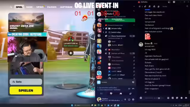 00:06:16Nach einer Unterbrechung wegen eines Deutschkurses wird der Titel des Streams erneut erklärt. Ein Live-Event ist für Freitag um 18 Uhr angekündigt, das sich auf Raketenstart 2.0 konzentrieren wird. Der Hauptteil des Events ist ein Quizformat namens "wer mich kennt", bei dem Zuschauer 1000 V-Bucks gewinnen können. Dazu müssen sie drei hintereinander gestellte Fragen über den Streamer beantworten, wobei jede Schwierigkeitsstufe einfacher wird. Teilnehmer müssen im Discord auf den Streamer warten, um einzeln ausgewählt und angesprochen zu werden.
