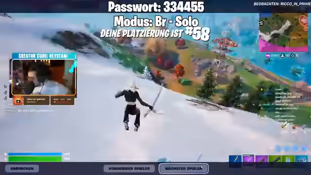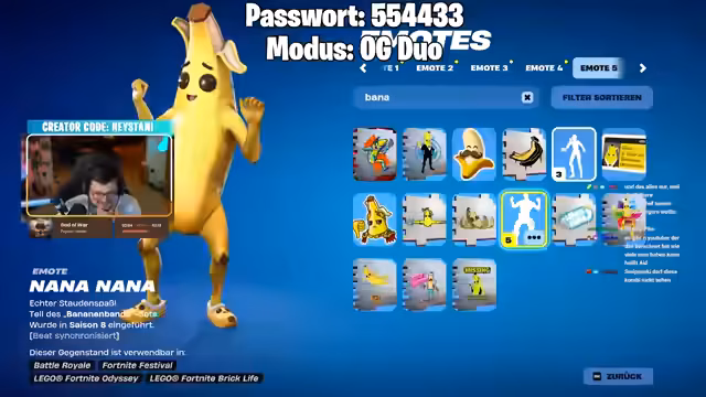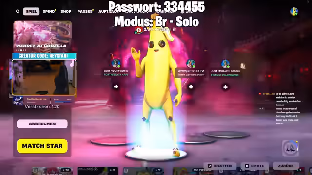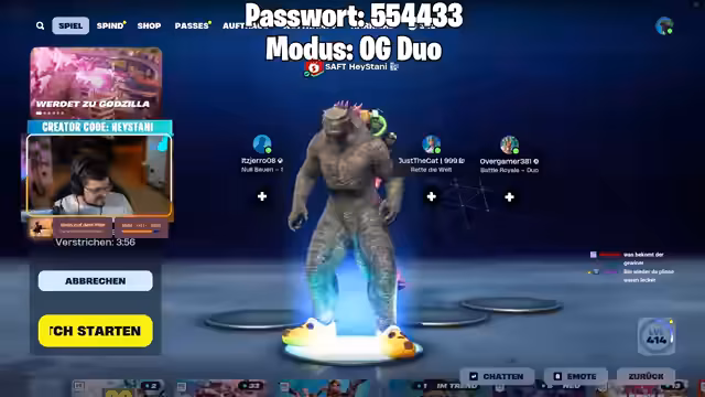 03:55:50Nach der erfolgreichen Godzilla-Runde wechselt der Streamer zum 'OG Duo'-Modus in Fortnite. Er unterhält sich über Kosmetik, insbesondere Bananenschuhe, die er als eines der besten Items im Spiel ansieht. Während des Wartens auf die Lobby, erwähnt er seinen geplanten Stream für Detroit Become Human im Laufe des Tages und zeigt wiederkehrend das Passwort für den Custom-Lobby-Eintritt.