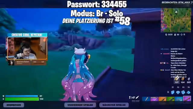 03:18:40Der Stream startet mit mehreren Versuchen, einen Godzilla-Modus in Fortnite zu aktivieren. Nach mehreren gescheiterten Runden, die jeweils neu gestartet werden müssen, wird schließlich eine Runde mit 90 Spielern und einem garantierten Godzillaspawn in Seaport City initiiert. Teilnehmer werden angewiesen, sich zu verstecken und keine Waffen zu benutzen, um einen disqualifizierten Sieg zu vermeiden und die Jagd auf Godzilla zu ermöglichen.