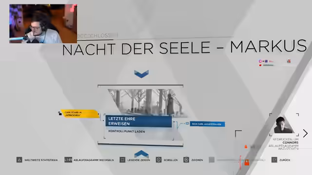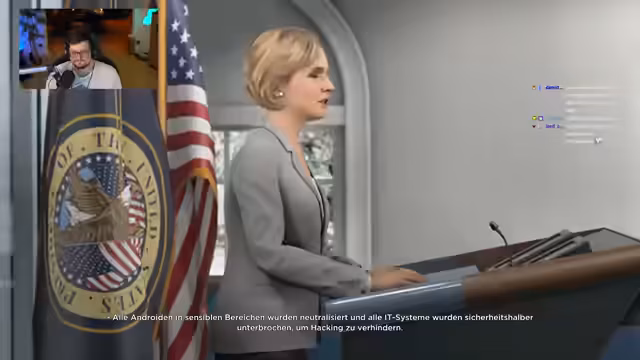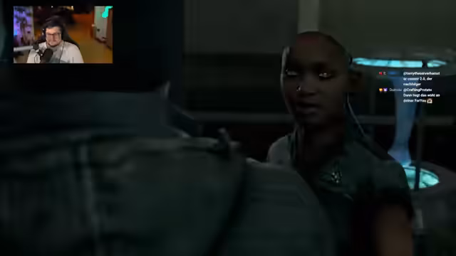 05:46:30Der Streamer wechselt zum Spiel Detroit: Become Human und spielt eine Sequenz, in der der Android Connor einen Raubüberfall in einem Vergnügungspark untersucht. Bei einer Konfrontation mit zwei Androiden, Jerry und Jerry, entscheiden sich der Streamer und die Community für eine friedliche Lösung, indem sie die Waffe nicht ziehen. Danach findet Connor die Leiche von Alice, was bei ihm Skrupel auslöst und die ethische Frage nach der Behandlung empfindungsfähiger Androiden aufwirft. Die Szene endet mit einer Rettungsaktion, bei der Connor und Markus aus dem Gebäude fliehen, während Simon zurückgelassen wird.