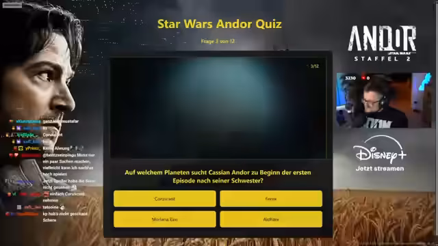 03:18:17Der Stream beginnt mit einem interaktiven Star Wars Quiz, moderiert von heystan. Erste Frage geht um den Schauspieler, der Cassian Andor verkörpert. Pedro Pascal wird als häufige, aber falsche Nennung identifiziert. Die richtige Antwort ist Diego Luna. Eine zweite, einfachere Frage identifiziert 'Rogue One: A Star Wars Story' als direkten Vorgänger der Serie Andor. Die dritte Frage erfordert mehr Serienkenntnis: Der Planet, auf dem Cassian zu Beginn nach seiner Schwester sucht, ist Molana 1, nicht der populäre Coruscant.