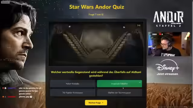 Im Rahmen der Zusammenarbeit mit Disney Plus wurde eine vierwöchige Kooperation gestartet. Den Anfang macht heute um 18 Uhr ein großes Quiz zur Serie 'Andor'. Geplant sind für die kommenden Wochen auch ein Koch-Stream und ein weiteres Quiz zur zweiten Staffel der Serie. Ein Trailer zu Staffel 2 sorgt bei der Community für Begeisterung.