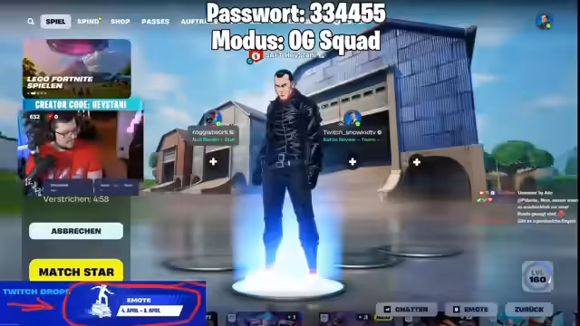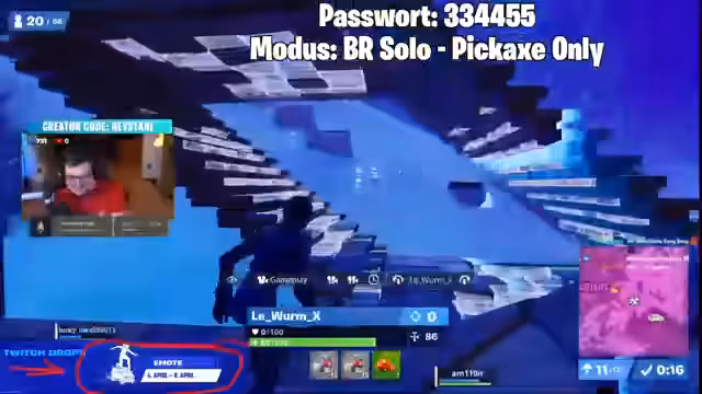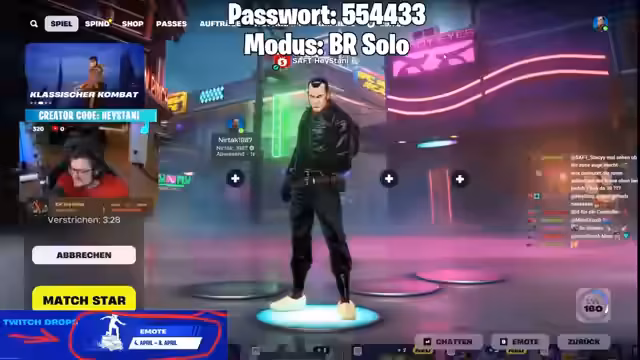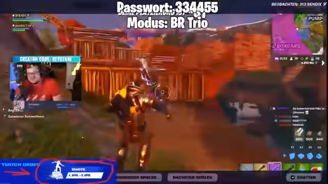 03:23:56Es wird angekündigt, dass als nächstes Zero-Build Trio gespielt wird, da dieser Modus heute noch nicht gespielt wurde. Der Streamer betont, dass er das letzte Wort hat, welcher Bonus gespielt wird. Es wird den Zuschauern Zeit gegeben, sich auf dem Discord-Server bereit zu machen und sich zu verifizieren, um reibungslos an den Custom Games teilnehmen zu können. Das Passwort für das Spiel ist 334455 und es sind noch 17 Plätze frei. Es wird darauf hingewiesen, dass Drops aktiv sind und man dies am Bild unten links erkennen kann. Der Streamer äußert seine Vorfreude darauf, mit welchen Mates er spielen wird.