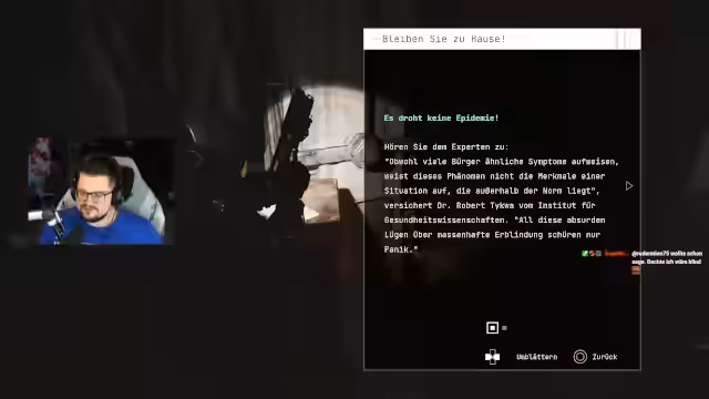 08:32:34Während des Dialogs mit dem Charakter Edward entdeckt die Spielfigur die schreckliche Wahrheit über die mysterious Krankheit, die die Stadt heimsucht. Ein Bewohner, Arter Benica, hat angeblich das Virus entdeckt, nachdem die Firma Stylerock unethische Experimente betrieben hat. Diese Informationen werden von den Behörden vertuscht, was zu einer Atmosphäre des Verrats und der Paranoia führt.