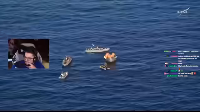 12:20:05Nach der erfolgreichen Wasserlandung konzentriert sich der Stream auf die komplizierte Bergungsoperation. Eine aufblasbare Plattform, der sogenannte 'Front Porch', wird an der Kapsel angebracht, um den sicher Ausstieg der Astronauten zu ermöglichen. Der Prozess dauert länger als erwartet, da die Seebedingungen den Vorgang erschweren. Nachdem die Plattform stabilisiert ist, beginnen die Astronauten mit dem Ausstieg. Der Streamer kommentiert jeden einzelnen Ausstieg als historischen Moment und freut sich, diesen gemeinsam mit der Community erleben zu dürfen, die mit ihm 13 Stunden am Stück im Stream war.