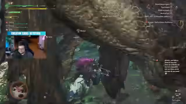 08:57:14Der Streamer kann Alea nicht einladen, aber Zerberster. Er schlägt vor, Alea in Fortnite einzuführen. Alea möchte Storyquests machen. Sie sind bereits in einer Umgebungslobby. Der Streamer ist zu weit in der Story fortgeschritten für Alea. Sie nehmen eine Anfängerrüstung, damit die Monster nicht zu schnell besiegt werden. Zerberster darf ein Monster auswählen, das sie gemeinsam jagen. Sie entscheiden sich gegen ein drachiges Monster, da Alea noch zu früh dafür ist. Sie wählen den Kongala, den Alea aber schon besiegt hat. Sie entscheiden sich für den Balahara in der Windebene. Der Streamer verliert die Umgebungsverbindung und schlägt vor, Alea die Mainstory machen zu lassen und immer dazuzujoinen. Alea nimmt einen Quest an und reist zum Basislager im Wald. Der Streamer gibt Alea Tipps zur Schnellreise. Er brauchte selbst 10 Stunden, um alle Menüs zu verstehen. Die Cutscenes werden als gut gerendert gelobt und der Charakter des Streamers als perfekt getroffen. Sie müssen die Wutwuts hauen. Der Streamer wechselt zur Gewehrlands, die er noch nie gespielt hat. Alea möchte den Bogen ausprobieren, aber der Streamer mag Fernkampf nicht. Er bevorzugt die Gläfe.