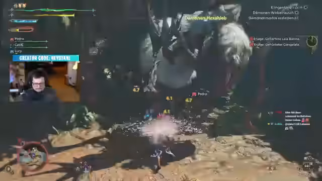 07:25:08Der Spieler farmt Materialien von gehärteten Monstern wie einem Gravios, um eine neue Waffe craften zu können. Während der Jagd bittet der Streamer Zuschauer wie Crazy Cat und Redemption zu einer gemeinsamen Runde, was den Beginn eines Stream Together Events ankündigt. Es kommt zu technischen Herausforderungen beim Verbinden der Lobbys, wobei der Streamer das Spielmenü als komplex und unübersichtlich kritisiert.