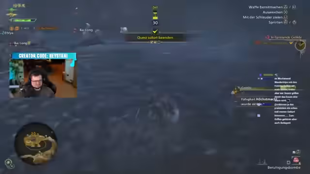 08:47:35Gelingt der Verbindung zu Alea, dem Sänger der Band Saltatio Mortis. Der Streamer ist begeistert, den Musiker im Spiel begrüßen zu können und stellt dessen beeindruckenden Werdegang vor, einschließlich seiner 25-jährigen Karriere in der Musik und seines Kung-Fu-Trainings. Alea schildert seine Leidenschaft für Gaming und wie er mit Ocarina of Time aufgewachsen ist.