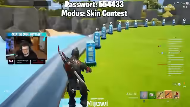 01:18:11Für neue Teilnehmer wird erklärt, wie man dem Custom Game beitritt. Man findet unten rechts den Button 'benutzerdefinierte Schlüssel' und gibt dort den Code '554433' ein. Es wird betont, dass man auch den Creator Code 'HeyStunny' im Itemshop aktivieren soll, um in die richtige Runde zu gelangen. Andernfalls landet man in einer falschen Runde. Teilnehmer, die bereits eine Skin-Kombo haben, können diese ingame finalisieren, da die Spielerzahl bereits voll ist. Wer rausgeschmissen wird, war zu spät dran. Switch-Nutzer müssen die Map erst herunterladen. Die Spieler werden aufgefordert, sich auf die Buden im Kreis zu verteilen. Es wird kurz die Ähnlichkeit der Map mit denen von Junsi erwähnt.