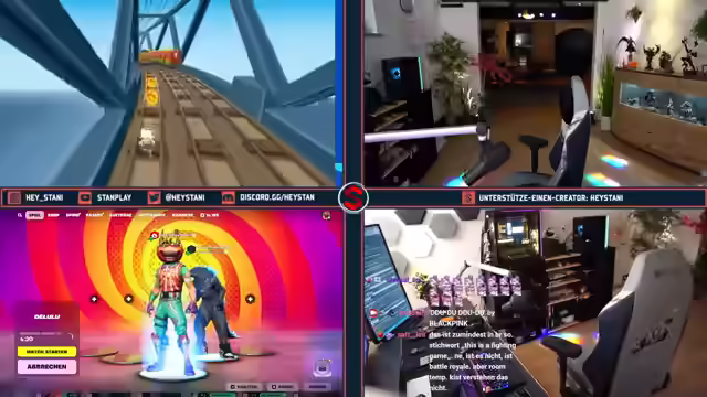00:33:35Es wird auf die Bedeutung des Creator Codes 'heystan' im Item-Shop hingewiesen, besonders für Zuschauer, die den Streamer unterstützen möchten. Es wird erklärt, dass Epic Games zum ersten Mal seit sieben Jahren eine Bonusaktion durchführt, bei der Creator doppelt so viel Umsatzbeteiligung erhalten. Das investierte Geld wird in die Verbesserung des Studios gesteckt, wie z.B. in eine neue Beleuchtung, die im Stream für eine höhere Qualität sorgt. Es wird eine Lasershow mit Nebel angekündigt, die bei besonderen Ereignissen wie einem Hype Train zum Einsatz kommen soll, um eine Party-Atmosphäre zu erzeugen. Es wird die neue Lichtanlage vorgestellt, die die Streams und die Quellebeleuchtung aufwerten soll.