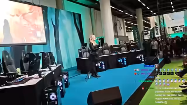 01:59:49Die Veranstaltung startet mit der Ankündigung und Vorstellung der Teilnehmer des Cosplay-Contests. Streamer werden als Jury-Mitglieder erwähnt, ohne ihre genaue Rolle näher zu definieren. Die Jury befindet sich am Bühnenrand und muss sich orientieren, um die Teilnehmer gut beobachten zu können. Unter den Teilnehmern sind sowohl Cosplayer aus League of Legends als auch aus anderen Universen wie Sailor Moon und The Witcher vertreten. Die Atmosphäre ist geprägt von Aufregung und enthusiastischem Zuspruch aus dem Publikum.