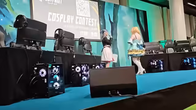02:56:04Der Cosplay-Contest wird mit einem Gruppenfoto aller Teilnehmer auf der Bühne abgeschlossen. Es folgt eine anschließende Diskussion über die Gesamtperformances, der offizielle Gewinner wird präsentiert und die Jury-Tätigkeit wird reflektiert. Der Streamer wechselt dann von der Bühne in die Veranstaltungsräume, beschreibt die Stimmung und die anstehende Party-Phase. Es werden erste Eindrücke der Messeumgebung und der diversen Besucherströme vermittelt.
