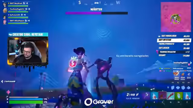01:04:22Die Hauptaktivität besteht im Spielen von Fortnite im „Creator Modus“ im Team mit anderen deutschen Creators wie Rubik’s und Maxify. Der Streamer beschreibt das Spiel als chaotisch und schnell, mit vielen Kämpfen und strategischem Bauwerk. Obwohl er manchmal unzufrieden mit der Performance seiner Mitspieler ist, führen sie mehrere Runden zu Ende und feiern Siege.