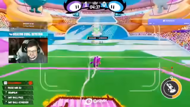 01:35:38Die ersten Spielrunden im 'Crown Jam'-Modus werden absolviert. Der Streamer beschreibt das Gameplay als 'schnell', 'dynamisch' und 'eine Mischung aus Rocket League und Fall Guys'. Er testet verschiedene Fähigkeiten wie Passen und Tackeln und bemerkt, dass Teamplay eine wichtige Rolle spielt. Die deutsche Übersetzung im User Interface wird als fehlerhaft kritisiert.