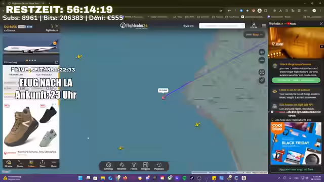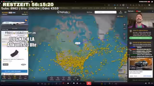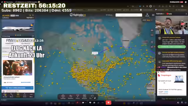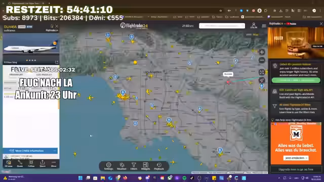 06:19:58Der Streamer hat Las Vegas bereits hinter sich gelassen und es sind angeblich nur noch 33 Minuten bis zur Landung. Die Überquerung der Grenze zwischen Nevada und Kalifornien steht bevor. Währenddessen wird im Chat über das Spiel und die Flugverfolgung gesprochen. Es wird erwähnt, dass das Flugzeug über der Mojave-Wüste ist und bald die Interstate 40 überfliegen wird. Über Los Angeles sind viele Flugzeuge auf dem Radar zu sehen. Die Flugzeit verlängert sich unerwartet um sieben Minuten, obwohl sich das Flugzeug weiterbewegt. Es wird vermutet, dass dies an der Warteschlange vor der Landung liegen könnte. Später wird bestätigt, dass das Flugzeug bereits im Landeanflug ist und an Höhe verloren hat. Die Ankunft in Los Angeles wird auf 23 Uhr Ortszeit geschätzt, wobei noch die Zeit für Terminal, Gepäck und Einreisekontrolle sowie das Besorgen einer amerikanischen SIM-Karte berücksichtigt werden muss.