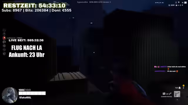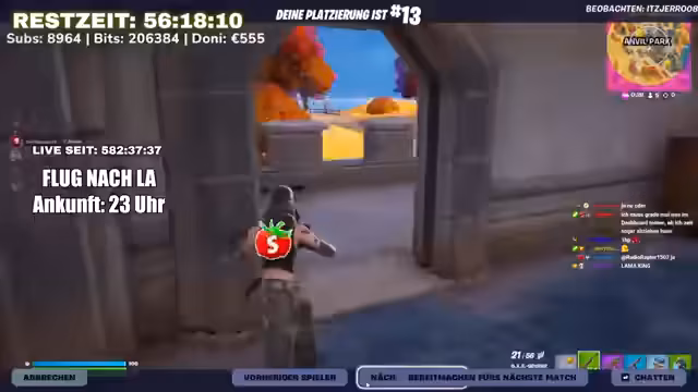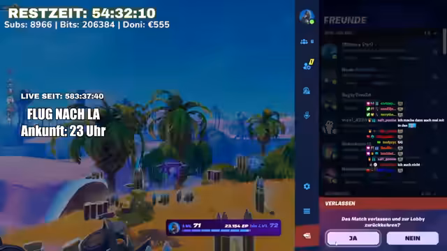 02:19:00Der Grund für den Flug nach L.A. wird humorvoll mit dem Wunsch nach Döner und dem Treffen von Freunden aus der Fortnite-Szene erklärt. Es wird erwähnt, dass Stan sein Handy im Auto vergessen hat und daher nicht erreichbar ist, außer über WhatsApp am PC via TeamViewer. Die Streamer scherzen über das Teilen von Stans Telefonnummer für 1000 Subs. Es wird über eine Klausur von Slasher gesprochen, die 'ganz gut' lief. Ein Wettbewerb um die höchste Watchtime unter den Zuschauern wird gestartet, wobei Zahlen von 2,4 Millionen bis fast 5 Millionen genannt werden. Die Streamer suchen nach dem Namen eines Zuschauers, der seine Watchtime nie verloren hat, obwohl sein Name nicht bekannt ist. Ein Streamer geht in TeamViewer, um nach 'Saft Blackie' zu suchen, einem ehemaligen Gamertag, der ihm bekannt vorkommt.