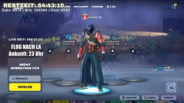 02:00:46Es wird über den Flug nach L.A. gesprochen, wobei erwähnt wird, dass sie sich gerade über Grönland befinden und noch einige Stunden bis zur Ankunft haben. Ein Zuschauer isst Brötchen mit Hähnchen und Käse, was die Diskussion über Essen wieder aufleben lässt. Ein Streamer bietet an, die Verbindung von Visco für fünf Subs zu trennen, um den Flug nicht mehr zu sehen. Es wird über technische Probleme eines Zuschauers gesprochen, der mit Hilfe von ChefGBT alles wiedergefunden hat. Ein Streamer beklagt sich über fehlende Abwechslung und fragt, warum er nicht abgeholt wurde, obwohl er Urlaub hat. Es wird über Fortnite-Updates und die Abneigung gesprochen, darüber zu streamen. Die Diskussion wechselt zu Fortnite-Leaks, die für den nächsten Tag aufgespart werden sollen, und über nervige Emotes im Chat, insbesondere das 'Fortnite Baby'-Emote.
