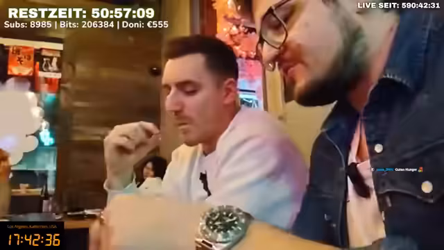 02:41:59Es wird scherzhaft gefragt, ob die 28 Zuschauer keine Lust auf den Streamer haben. Tarek wird aufgefordert, etwas zu erklären, verschwindet aber kurz. Slasher wird aufgefordert, seine Arbeit zu machen und zu übernehmen. Ein Streamer bietet an, Subs zu verschenken, wenn jemand 'ich' schreibt, um Slasher dazu zu bringen, zu streamen. Slasher wird erneut aufgefordert, zu kommen, da der Streamer seine Goldfische füttern muss. Bisco kommt mit Essen zurück, und es wird über zwei Scheiben Fleisch in der Pfanne, Pommes und einen selbstgemachten Joghurt-Dip gesprochen. Es wird über einen schlechten MB-Upload von Slasher gesprochen. Die Gründe für Stans Reise nach L.A. werden erneut humorvoll zusammengefasst: Milch holen, Döner essen und Kato treffen.