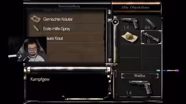 01:52:49Der Streamer wechselt zum Spielen von Resident Evil 1. Der erste Durchlauf startet mit der Jill-Variante auf einem niedrigen Schwierigkeitsgrad. Das Ziel ist es, alle Räume zu betreten und alle Items zu sammeln. Der Streamer zeigt sich ungewohnt unsicher und muss sich an die alten Spielmechaniken, wie das Inventarmanagement und das langsame Bewegen in Fixszenen, gewöhnen und erinnert sich an das prägende Spielerlebnis.