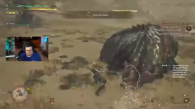 04:39:50Der Streamer stellt sich vor, wie es wäre, wenn solche Viecher in der realen Welt herumlaufen würden. Er kämpft gegen den Balahara und versucht immer zu dodgen, ist aber oft mitten in der Angriffsanimation. Er schlägt dem Balahara die Schädeldecke auf und bricht ihm den Schwanz. Er vermutet, dass man größere Waffen braucht, um einen Schwanz abzuschlagen. Er schleift seine Waffe und muss seinen Beutel machen. Er bemerkt, dass der Balahara Felsen aufgesammelt hat und dass die Spitze ab ist. Er hätte das Fangnetz nutzen können, um den Balahara zu fangen. Er nimmt Messer und Gräme raus und nimmt Opalfossil mit. Er wird von einem Dorfbewohner gerettet und erfährt, dass das Dorf in großer Gefahr schwebt. Er soll den Ältesten überzeugen, Schutz zu suchen. Er sieht, wie sich die Dorfbewohner vor den Doshaguma in Sicherheit bringen. Er soll die Doshaguma vertreiben und das Dorf beschützen.