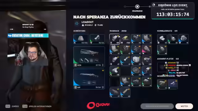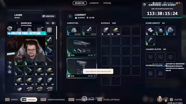 02:29:32Zu Beginn des Stream-Ausschnitts beschäftigt sich der Spieler mit den grundlegenden Mechaniken des Upgrades von Waffen. Es wird erklärt, dass graue Waffen günstig zu verbessern sind, während die Verbesserung von Waffen mittlerer Stufe wie Ferro 1 spezifische Teile wie mechanische Komponenten oder Waffenteile erfordert. Es werden konkrete Waffennamen wie Rattler und Arpeggio genannt und eine Strategie für den schnellen Aufbau von Gratis-Waffen nach einem Run skizziert. Des Weiteren wird die strategische Entscheidung thematisiert, welches Loadout mitgenommen wird und welche Gegenstände wie Raider-Lupen-Schlüssel für Quests wichtig sind.