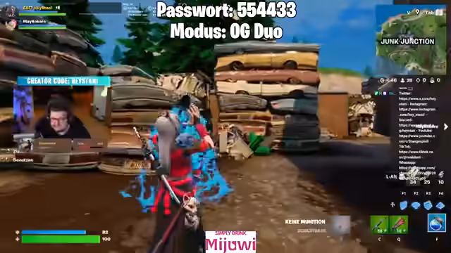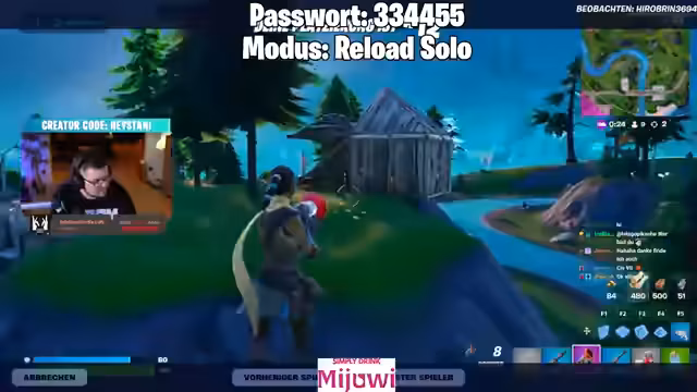 04:30:59Nach den kulinarischen Exkursen wird die Lobby für ein neues Duo-Spiel in Fortnite betreten. Ein Zuschauer kommentiert humorvoll die Abwesenheit des Streamers mit dem Befehl 'Wo ist Stan?'. Der Streamer bestätigt den Start des Spiels und beginnt mit einem Duo-Partner, wobei er sich über sein eigenes Gameplay lustig macht und seine eher bescheidenen Fähigkeiten im Vergleich zu den Chat-Erwartungen thematisiert.