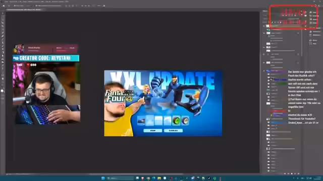 09:32:43Nachdem der Streamer kurz erwähnt, etwas für den Stream vorbereiten zu müssen, geht er live auf die Erstellung eines YouTube-Thumbnails für ein Update-Video ein. Er zeigt, wie er versucht, Charaktere aus Fantastic Four in ein Bild einzufügen, ist aber mit dem Ergebnis unzufrieden. Der Streamer diskutiert mit dem Chat, welche Elemente ein ansprechendes Thumbnail benötigen, und stellt fest, dass es für den Fortnite-Kontext spektakulärer sein müsste, um Klicks zu generieren.