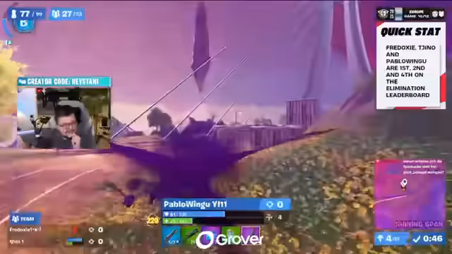 06:32:23Das aktuelle FNCS-Turnier läuft weiter, und der Streamer analysiert das Spielgeschehen. Pablo Wink und Fredoxy sind im Endgame, während Vico versucht, Punkte aufzuholen. Der Streamer kommentiert die Aktionen der Teams im Detail, darunter einen "Chase" und einen "Heel Turn". Am Ende gewinnt das Team von Pablo Wink und Fredoxy, während Vico den zweiten Platz belegt.