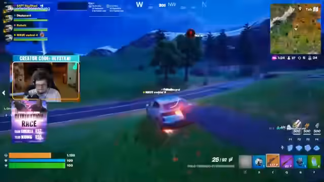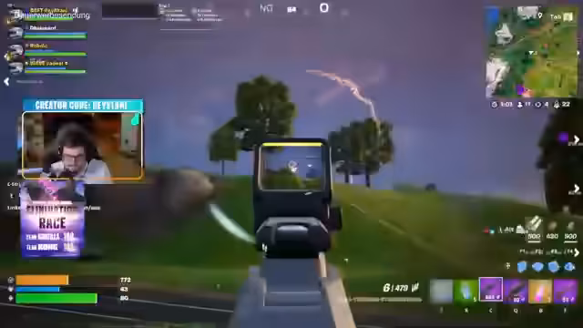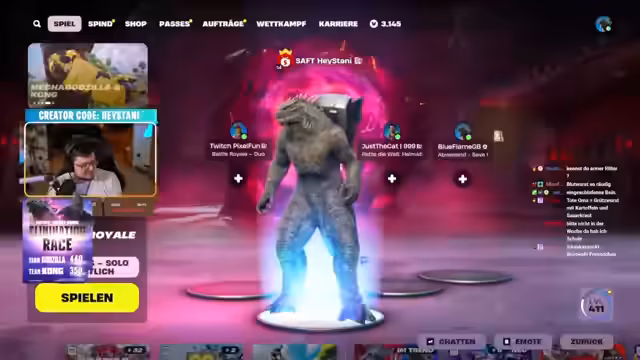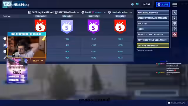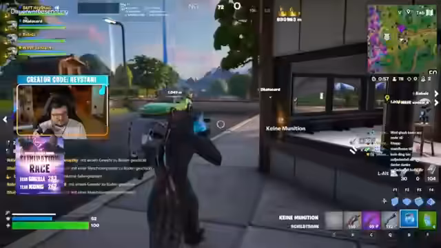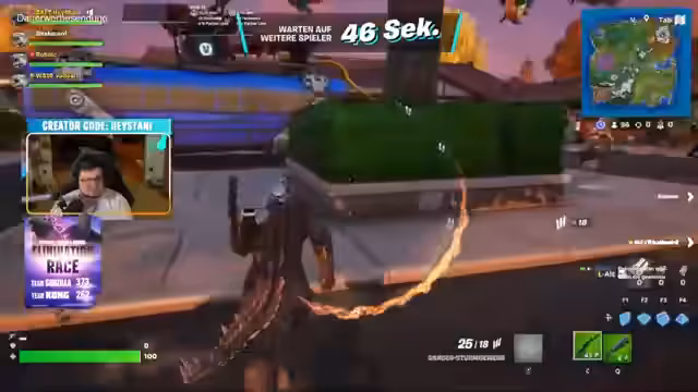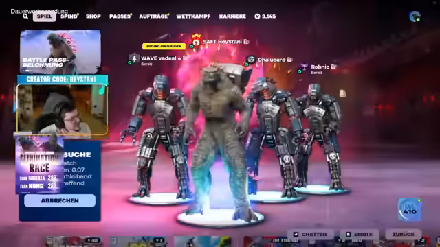 02:40:13Das Godzilla-Kong Creator Battle beginnt pünktlich um 18:05 Uhr. Das Team Godzilla, bestehend aus dem Streamer, Robnik, Vardial und Dalukat, startet in das Turnier. Sie landen an einem Slurp Truck und planen, Godzilla zu finden oder ihn zu töten, um Punkte zu sammeln. Der Streamer erklärt die Taktik: zuerst looten, dann auf Godzilla achten und wenn er erscheint, alle Spieler auf ihn konzentrieren. Sie beschaffen sich spezielle Waffen wie die Railgun, die extra Schaden gegen Godzilla anrichtet. In der ersten Runde gelingt es dem Team, Godzilla zu finden und Punkte zu sammeln.
