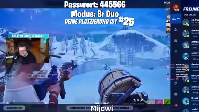 03:51:36Der Streamer wechselt während des Streams zwischen verschiedenen Spielmodi in Fortnite. Er spielt Runden im populären Pillars-Modus auf einer benutzerdefinierten Map, welche er für chaotisch, aber unterhaltsam hält. Er betont die Wichtigkeit, den öffentlichen Status der Creative-Map einzustellen, damit andere beitreten können. Gleichzeitig erwähnt er die aktuelle Story-Aufgabe mit dem Live-Event und die Geisterwelt, die mit der bevorstehenden Season 2 zusammenhängen könnten. Er fordert die Zuschauer auf, dem Stream zu folgen, um keine Informationen zu verpassen.