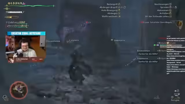 08:54:54Der Stream wechselt zum Thema Gaming. Die Teilnehmer starten eine gemeinsame Jagd in Apex Legends. Stan ruft Zuschauer auf, der Gruppe beizutreten, um bei der Jagd nach bestimmten Kronen-Viehchern zu helfen. Es werden spezifische Monster wie Wächter und Ratalos genannt, die für den Fortschritt benötigt werden. Der Streamer organisiert die Gruppenzusammenführung und bereitet die Jagd vor.