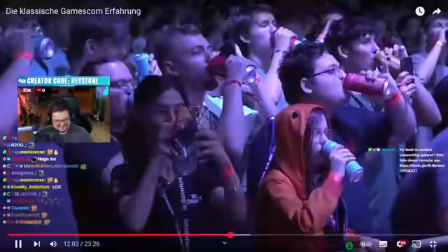 02:52:55Der Streamer widmet sich den Erfahrungen auf der Gamescom, die er als ein audiovisuelles Erlebnis beschreibt. Er erinnert sich daran, wie er in der Eventhalle bei Präsentationen mitgejubelt hat, obwohl er nicht wusste, worum es ging. Eine besonders prägende Erinnerung teilt er mit einem Zuschauer, als sie gemeinsam die "Opening Nights" live erlebten, bei denen eine Person auf die Bühne stürmte. Dies führte dazu, dass seitdem verstärkt Security präsent ist.