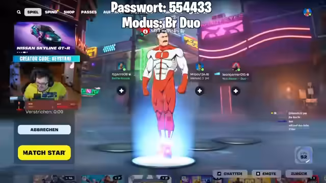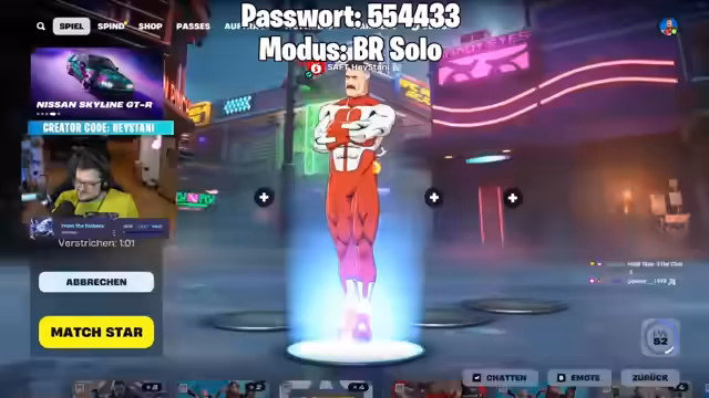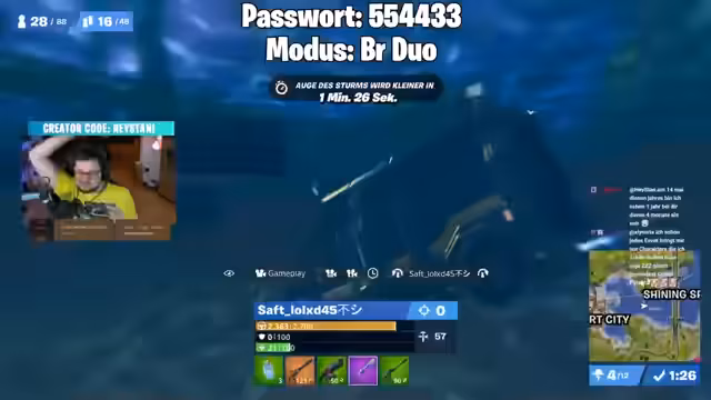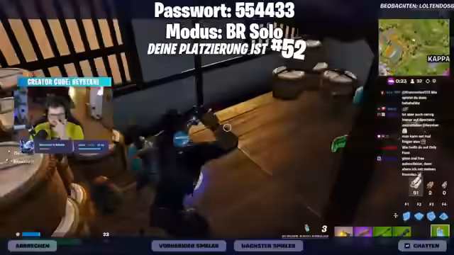 00:28:56Nach den Ankündigungen beginnt die eigentliche Session mit benutzerdefinierten Fortnite-Spielen. Die erste Lobby wird eröffnet, mit dem Ziel, die Spieler für das Hauptevent vorzubereiten. Es gibt jedoch technische Probleme; der Streamer merkt an, dass er den Spectator-Modus vergessen habe, was die Beobachtung der Spieler erschwere. Die Passwörter für die Lobbys werden im Chat geteilt, und es werden neue Spieler aufgefordert, beizutreten.