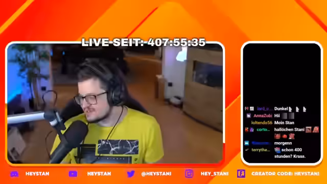 00:04:43Der Live-Stream beginnt mit einer herzlichen Begrüßung der Community und der Nennung vieler langjähriger Stammzuschauer. Streamer heystan feiert den bemerkenswerten Meilenstein von 400 Stunden ununterbrochenem Streaming, was länger sei als die Summe aller anderen Streamer. Er begrüßt unter anderem Anazubi, Loltendo und Kratzo, die seit Langem dabei sind, und interagiert direkt mit den Chat-Teilnehmern, darunter jemand ohne Namen, der aufgefordert wird, sich einen zu geben.