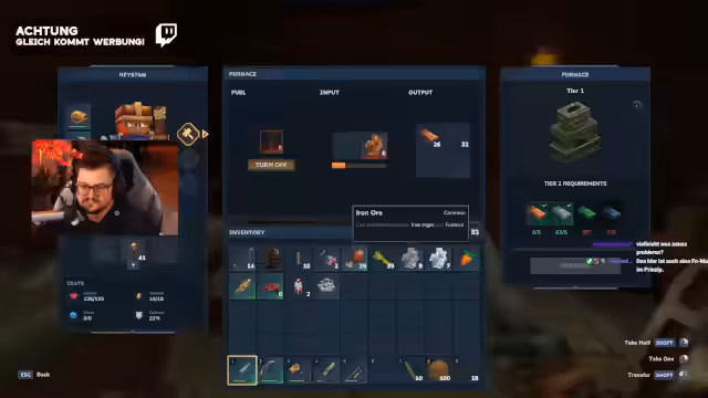 05:16:40Der Streamer sammelt mehrere Stacks Eisen und Silber, bemerkt aber die Verwechslung von Eisen und Silber durch ähnliche Textur. Er stellt Eisenrüstung und eine Spitzhacke her, um den Fortschritt zu beschleunigen. Die Workbench wird geupgraded, wodurch ein Backpack freigeschaltet wird, das die Kapazität erhöht. Jedoch fehlt Medium-Leder für weitere Upgrades, also plant er Jagd auf Kleintiere. Silber wird zwar gesammelt, aber sein Verwendungszweck bleibt unklar, während Thorium weiterhin fehlt.
