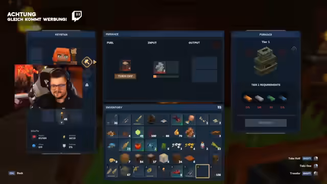 02:57:50Nachdem genug Kupfer gesammelt wurde, stellt der Spieler fest, dass Kupferwerkzeuge gefertigt werden können, aber Eisen benötigt wird, um die Arbeitsbank aufzustufen. Die Schmiedemechanik wird erklärt: Es gibt Truhen mit unterschiedlichem Aussehen, aber möglicherweise gleicher Funktion, und der Crafting-Prozess prüft automatisch, ob Materialien in Kisten vorhanden sind. Dieses System wird als 'geil' bezeichnet, da es das Inventarmanagement erleichtert und das Bauen von Möbeln und anderen Strukturen ermöglicht.