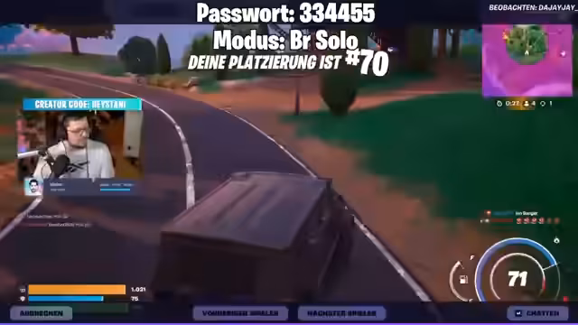 01:21:10Der Stream beginnt mit intensiven Custom Games in Fortnite. Es kommt zu mehreren dynamischen Kämpfen, in denen Spieler wie Soul Reaper, Beckerkecker und Nick auffallen. Soul Reaper glänzt mit konstant hohen Killzahlen und behauptet sich als einer der stärksten Teilnehmer. Immer wieder kommt es zu überraschenden Eliminierungen, wie als Pukki von Janis aus dem Spiel genommen wird. Ein Teilnehmer meldet einen angeblichen Aimbot, und es wird über das Verhalten und die Leistung verschied bekannter Spieler diskutiert.