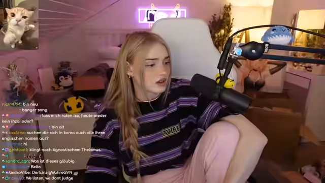 06:12:09Der Streamer zeigte den Zuschauern, wie er seine Katzen füttert und beschrieb, wie diese sofort reagieren, wenn sie Futter riechen. Es wurde über das Verhalten der Katzen gesprochen, insbesondere darüber, dass eine davon oft am Ohr des Streamers leckt. Zudem wurden private Themen angesprochen, wie zum Beispiel das Gewicht und das Gefühl, sich unwohl zu fühlen, was zu einer humorvollen Auseinandersetzung führte.