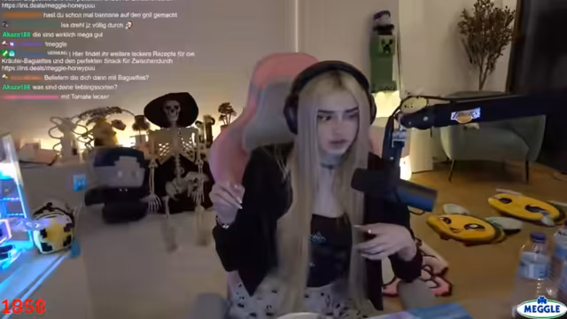 04:08:08Die Streamerin verkündet eine erneute Partnerschaft mit Meggle, einem Hersteller von Kräuterbaguettes. Sie erwähnt, dass sie Meggle-Produkte bereits von früheren Kooperationen kennt und diese als praktisches und leckeres Essen während des Streamens schätzt. Da Meggle-Produkte auf Madeira nicht erhältlich sind, hat ihr Vater ihr eine Kühlbox mit verschiedenen Baguette-Sorten (Kräuter, Knoblauch, Laugen) von Frankfurt nach Madeira mitgebracht. Sie hat mehrere Baguettes erhalten, zusammen mit einer Grillzange. Diese Baguettes werden nun ihr Essen für die nächsten Tage im Stream sein, da sie schnell zubereitet sind und gut zum gleichzeitigen Zocken passen. Sie überlegt, ob sie für zukünftige Sabaton-Streams weitere Meggle-Produkte anfragen kann.