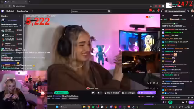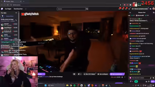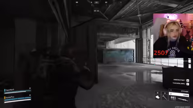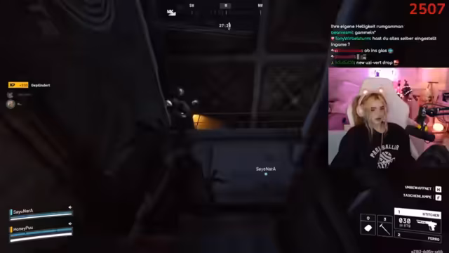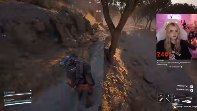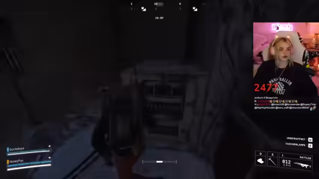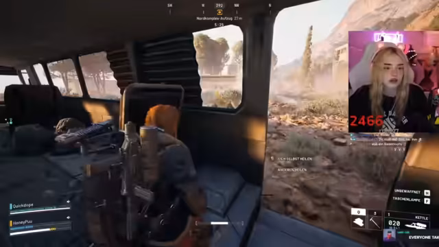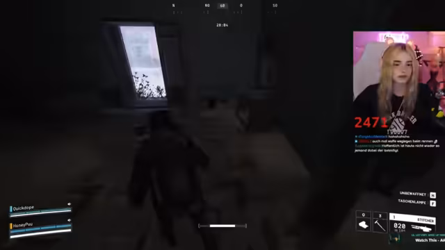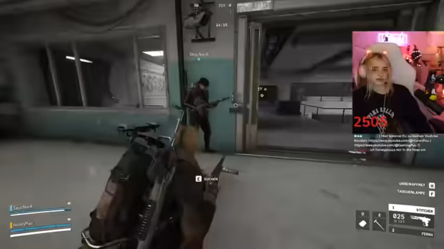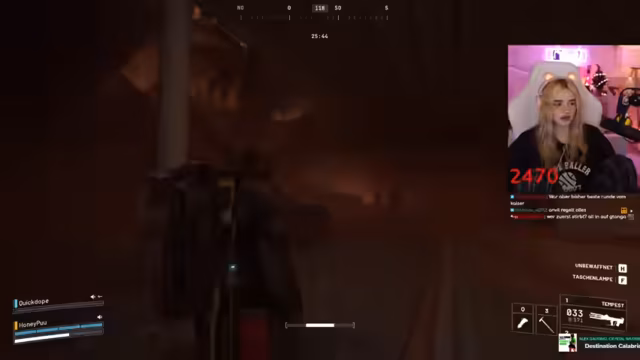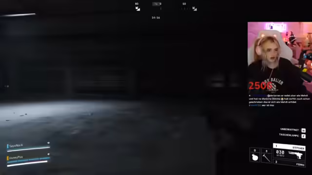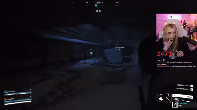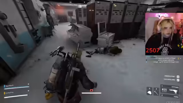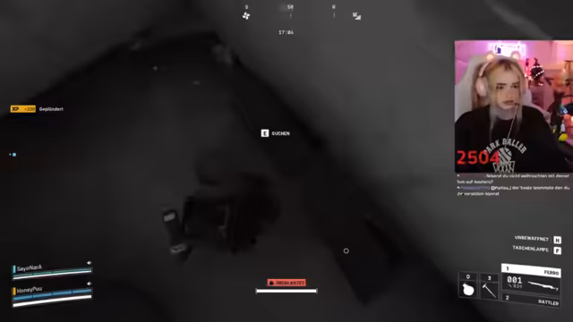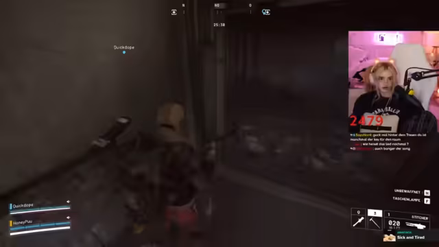 02:46:40Während des Gameplays koordinieren sich die Spieler im Kampf. Sie markieren Gegner, rufen Positionen zu ("Der ist low!") und versuchen, Drohnen auszuschalten. Eine markante Szene entsteht, als ein Gegner sich versehentlich selbst ausschaltet. Der Streamer lobt die Kampffähigkeiten des Gastes ("Du bist die Beste!"). Technische Probleme mit dem Stream-Together treten auf, unterbrechen aber nicht die Zusammenarbeit. Die Kommunikation bleibt dynamisch, mit häufigen Warnungen vor Gegnern und Fluchen im Kampfstress.