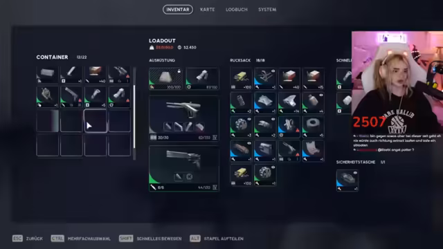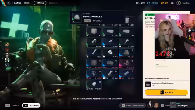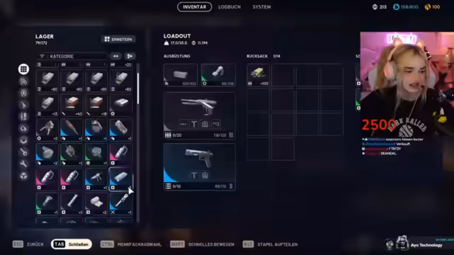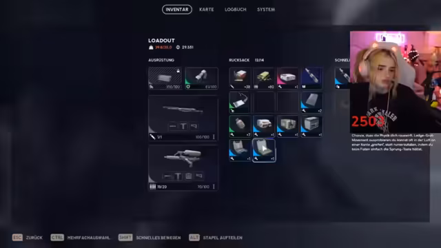 09:46:26Der Streamer bereitet sich auf sein letztes Spiel des Tages vor und überprüft seine Ausrüstung. Er diskutiert mit seinem Partner über benötigte Gegenstände wie Granaten und Schildaufladungen. Dabei kommt die finanzielle Situation zur Sprache - er ist pleite und muss sparsam wirtschaften. Trotzdem ist er motiviert für die letzte Runde und plant, das Maximum aus seinem verfügbaren Geld herauszuholen.